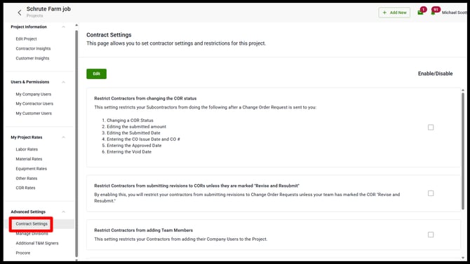 Contract Settings allow you to control what Contractors can do when submitting and managing Change Order Requests (CORs) on your projects