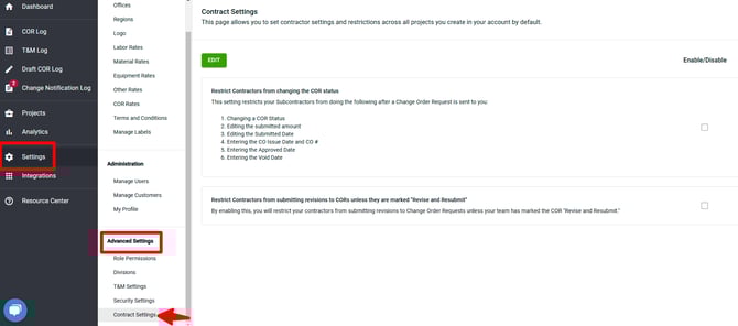- This setting ensures that contractors can only submit revisions to Change Order Requests if the COR is marked as "Revise and Resubmit" by your team.