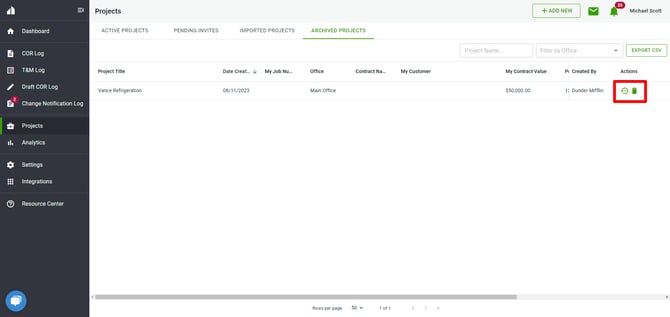 - On the archived projects page, you can do two things in the Action column.