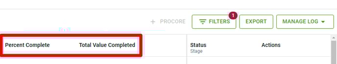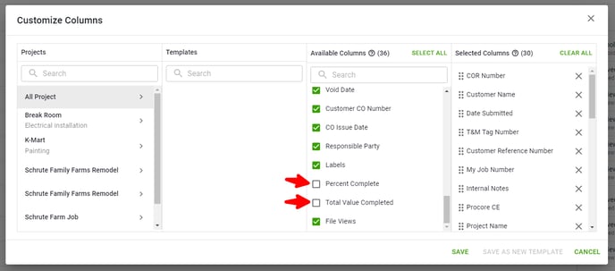 Under Available Columns, scroll down to the newly added choices: Percent Complete & Total Value Completed. Select these options and click Save.