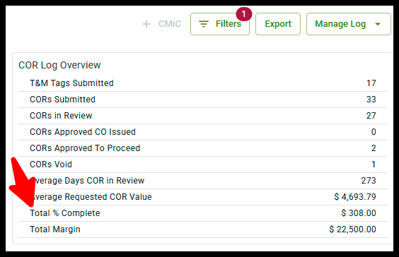 If you want to track the percent of work and the dollar amount completed on existing Change Order Requests, Clearstory has a feature to allow you to manually input this for each COR.