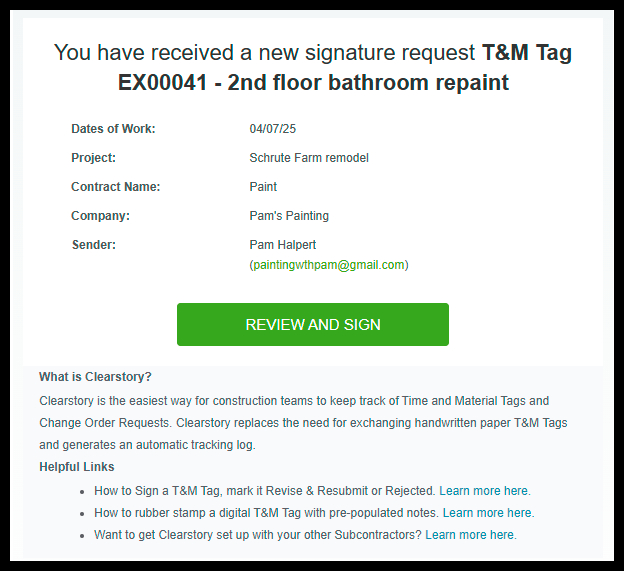 This article explains how to review and sign a T&M Tag in Clearstory, whether via email, the T&M Log, or mobile. It also walks through your options: Sign, Revise & Resubmit, or Reject.