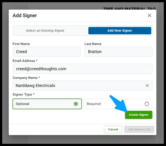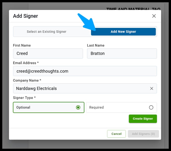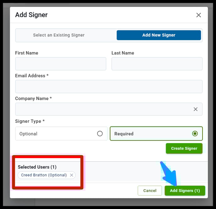 Or click Add New Signer to manually enter their details (First/Last Name, Email, Company, and whether they are Required or Optional).