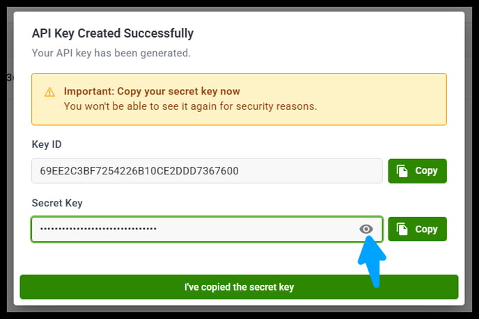 🔷 After securely saving your Secret Key, click I’ve copied the secret key to complete the process. Your API key will now appear in your API Keys list.