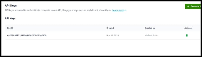 Deleting an API key immediately invalidates it. This action cannot be undone.