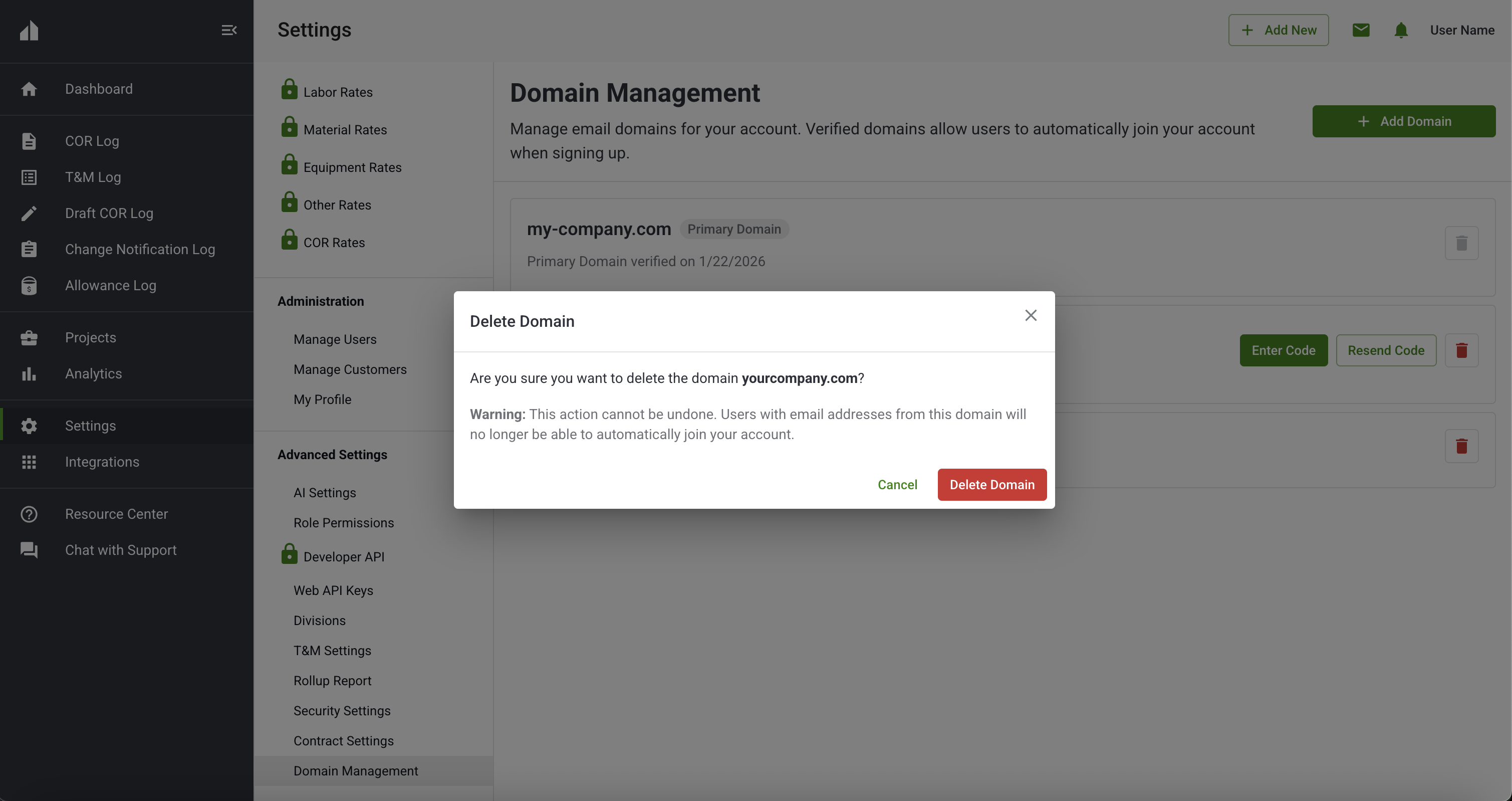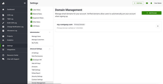 Your primary company domain, if owned, is always shown and cannot be removed.
