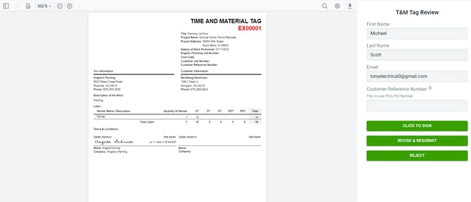 Click to Sign: If the Tag is approved you can sign it and add your comments. Simply sign your name and click Submit Signature. Any comments will also be added to the PDF in the "Customer Notes" section. Once signed, both you and the contractor will immediately receive an email copy of the T&M Tag.