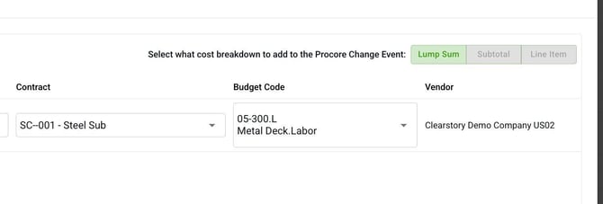 When you push a COR to a Procore Change Event, the system uses your contract mappings to automatically fill in the Contract, Budget Code, and Vendor.