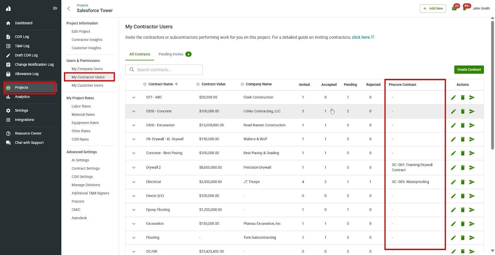 - Under the project menu, select My Contractor Users. You will see the contracts table, which includes a Procore Contract column showing the current mapping status of each contract.