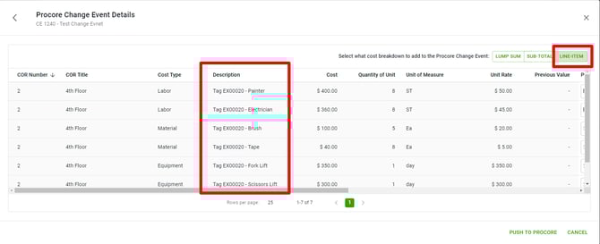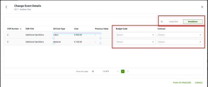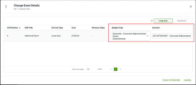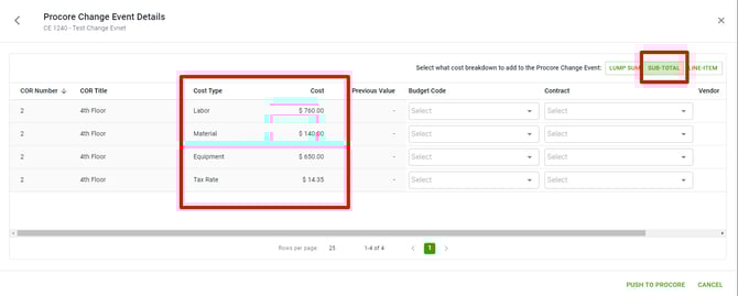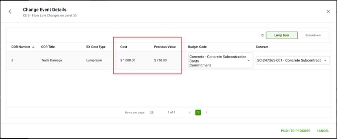 To update the Procore Change Event, Follow previous steps 1 - 3. This will show the previous and new totals.