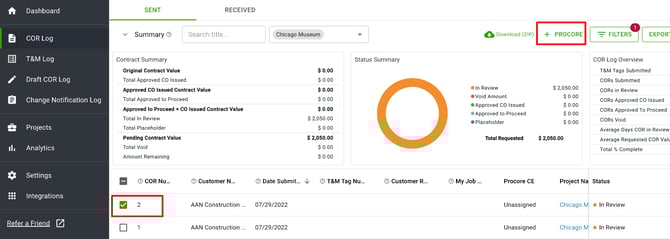 1. Select one or multiple CORs you would like to push to a Procore Change Event, then select +PROCORE