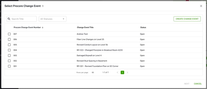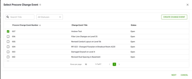 2. Select the Procore Change Event or Create a New Change Event, select Next