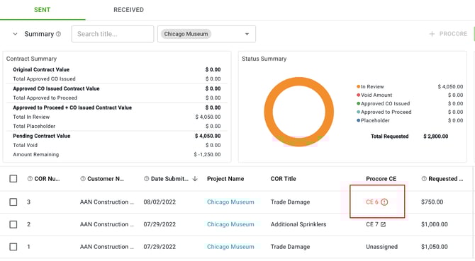 When changes are made to the COR in Clearstory, an alert on the COR Log will appear, letting you know you should push the update to the Change Event in Procore